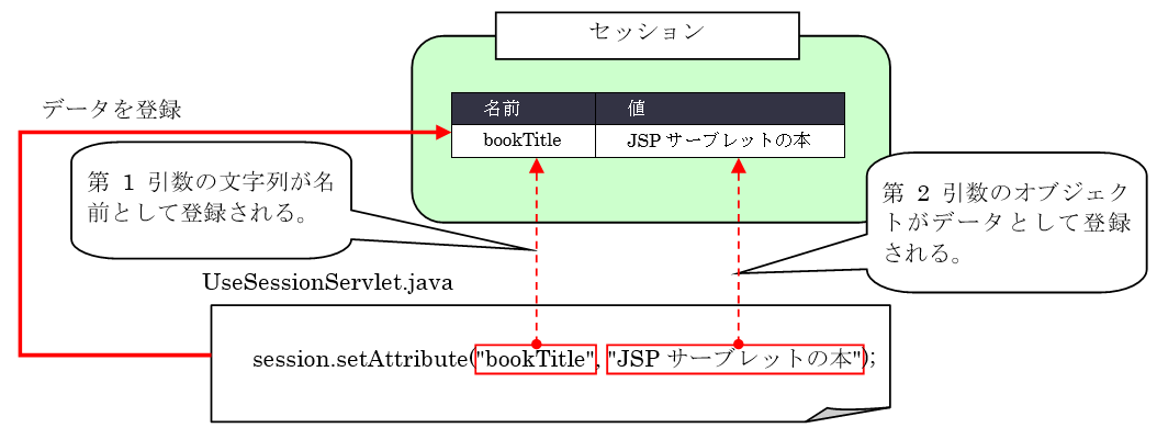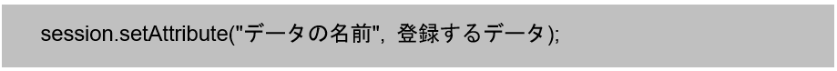 HttpSessionインタフェースのオブジェクトに用意されたsetAttribute()メソッドを利用することで、セッションへデータを登録することができます。メソッドの引数には、登録するデータとそのデータにつける名前を渡します。