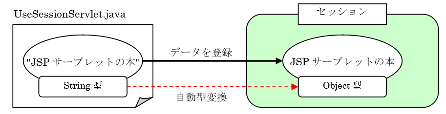 このときにセッションへ登録されるデータも、リクエストスコープと同様にObject型として登録されます。
