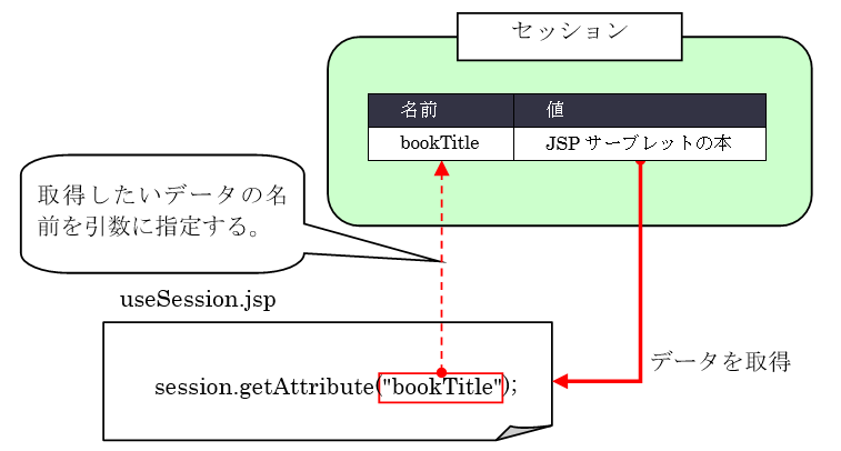 getAttribute()メソッドの引数に「bookTitle」という文字列を渡しています。この引数の文字列がセッションから取得するデータの名前になります。このデータの取得方法についても、リクエストスコープとの違いはメソッドを呼び出すためのオブジェクトが違うという点だけで、メソッドの使い方自体は全く変わりません。