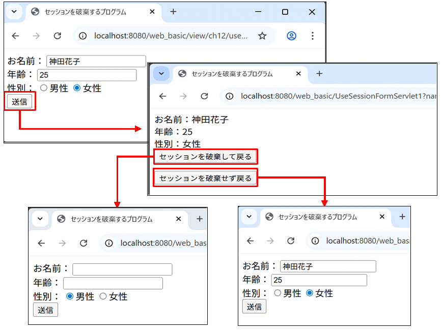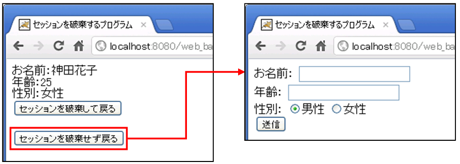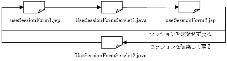 「セッションを破棄して戻る」を選択した場合はUseSessionFormServlet2.java、「セッションを破棄せず戻る」を選択した場合はuseSessionForm1.jspへ転送されます。