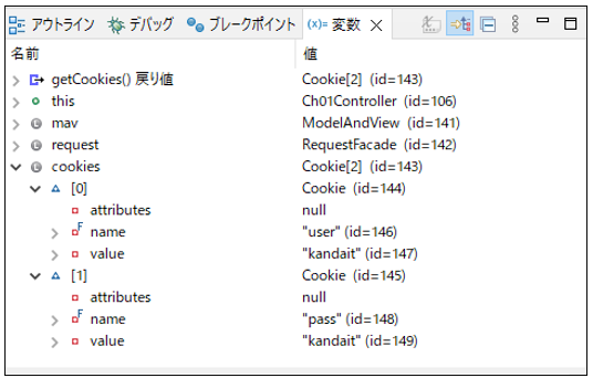 [java] // クッキーが存在するか確認 if (cookies != null) { for (Cookie cookie : cookies) { // クッキーからユーザー情報の取得 if (cookie.getName().equals("user")) { inputUser = cookie.getValue(); } // クッキーからパスワード情報の取得 if (cookie.getName().equals("pass")) { inputPassWord = cookie.getValue(); } // View に渡す変数を Model に格納 mav.addObject("inputUser", inputUser); mav.addObject("inputPassWord", inputPassWord); } } [/java]取得されたクッキー配列をデバッグ画面の変数ビューで確認すると以下の図のようになります。