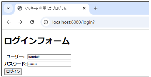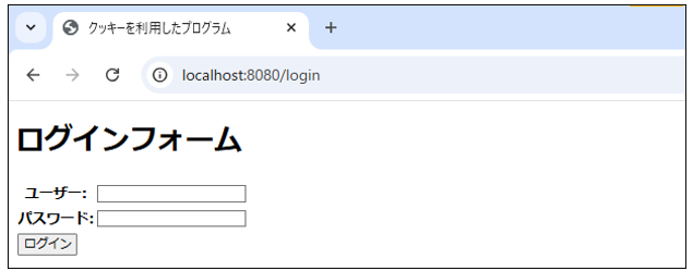 [html] <!DOCTYPE html> <html> <head> <title>クッキーを利用したプログラム</title> </head> <body> <h1>ログインフォーム</h1> <form action="/login2" method="POST"> <table> <tr> <th>ユーザー:</th> <td> <input type="text" id="user" name="user" th:value="${inputUser}"> </td> </tr> <tr> <th>パスワード:</th> <td> <input type="password" id="pass" name="pass" th:value="${inputPassWord}"> </td> </tr> <tr> <td> <input type="submit" value="ログイン"> </td> </tr> </table> </form> </body> </html> [/html]【ファイル名:login2.html】