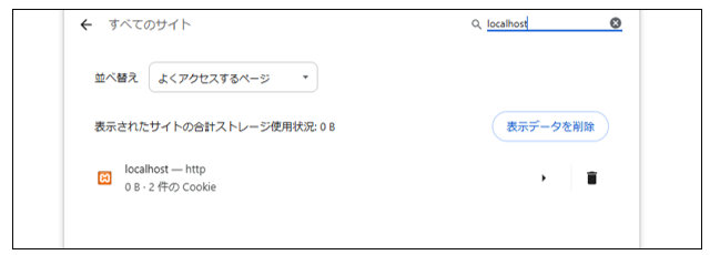 プログラムの解説をはじめる前に、プログラムにアクセスする前のクッキーの状態をブラウザから確認します。これまでの学習ではクッキーを利用したプログラムを作成していないので、localhostのサイト名のクッキーは登録されていません。