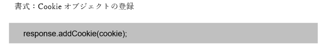 クッキーをクライアントに登録する場合は、まず、クッキーをレスポンスに登録し、レスポンスの情報とともにクライアントに送信する手順が必要です。クッキーをレスポンスに登録する場合は、responseオブジェクトに用意されたaddCookie()メソッドを利用します。メソッドの引数にはCookieクラスのオブジェクトを渡します。