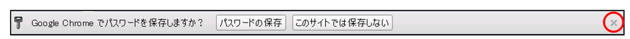 1回目のアクセス時には、ログイン後の画面が表示されると、パスワードの保存の確認が表示される場合があります。この表示はクッキーの登録の確認ではなく、ブラウザ独自の機能で、パスワードを保存するかどうかの確認です。ここでは表示の一番右にある「×」ボタンをクリックしておきましょう。以下の画面はGoogle Chromeでのパスワードの保存確認の表示です。ブラウザごとに異なりますのでご注意ください。