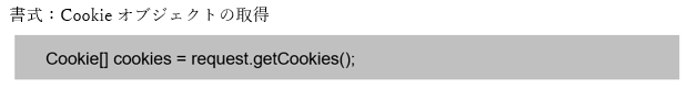 リクエストとともに送信されたクッキーを取得する場合には、HttpServletRequestインタフェースに定義された以下のメソッドを利用します。複数のクッキーが存在した場合、1つ1つのクッキーを個別に取得するのではなく、全てのクッキーを配列として取得することになります。