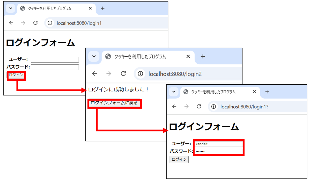 [html] <html> <head> <title>クッキーを利用したプログラム</title> </head> <body> <form action="/login1"> <p th:text="${msg}"> </p> <input type="submit" value="ログインフォームに戻る"> </form> </body> </html> [/html]