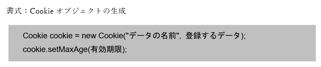新しくクッキーを作成する場合は、new演算子を利用し、Cookieクラスのオブジェクトを生成します。オブジェクトの生成を行う際に、引数としてデータの名前と登録するデータを渡します。また、クッキーには個別に有効期限を指定する必要があるため、setMaxAge()メソッドを利用し有効期限を秒単位で設定します。