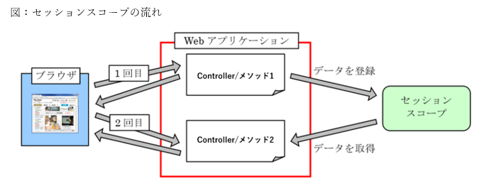 Webアプリケーションでは、複数のページをまたいでデータを共有したい場合があります。そのようなときには、スコープの一種であるセッションと呼ばれる仕組みを利用します