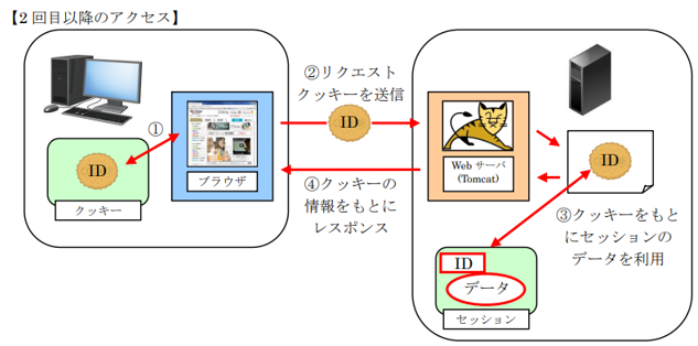 2回目以降のアクセス時には、リクエストと一緒にサーバーに送信されたクッキー(セッションID)をもとに、セッションのデータを参照することができます。