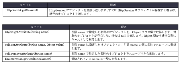 セッションを利用する場合、javax.servlet.http.HttpSessionインタフェースのオブジェクトを利用します。ここのHttpSessionインタフェースのオブジェクトはHttpServletRequestインタフェースに定義された以下のメソッドを利用し取得します。
