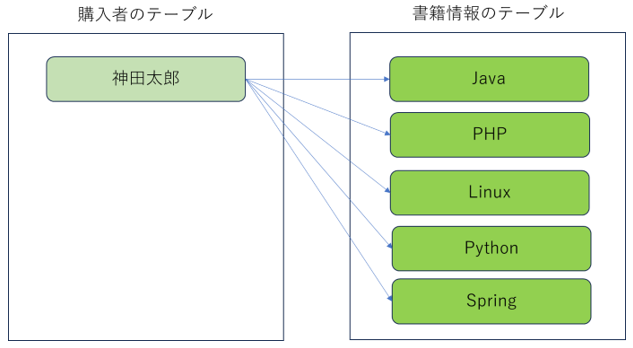 直訳すると、『多対1』となります。複数のエンティティに対し、もう一方のエンティティ1つだけが対応するものです。@OneToManyの逆で考えるとわかりやすいですが、書籍情報テーブルから見れば、複数の本が一人の利用者に紐づけされていることになります。