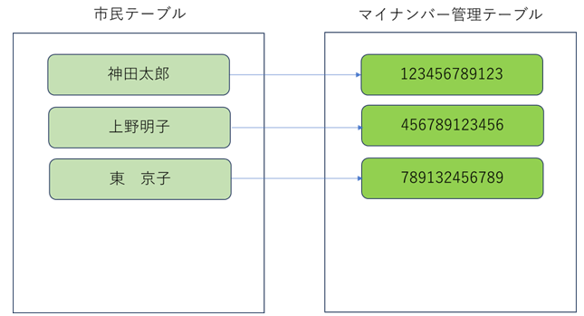 直訳すると『1対1』となります。その名の通り、2つのエンティティが1対1で対応する連携を示すものです。例えば、市民とマイナンバーで考えてみましょう。マイナンバーは原則として1名につき1件発行されます。これは1対1の関係が保たれていることになります。