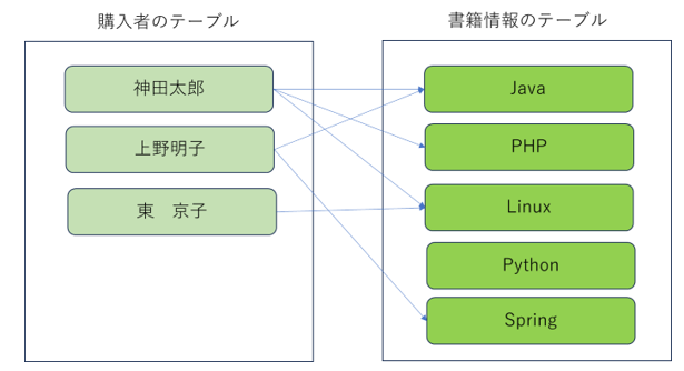 直訳すると、『多対多』となります。これは複数のエンティティに対し、他方のエンティティが対応するというものです。先ほどの本屋さんのシステムで考えてみましょう。1人の購入者は複数の本を購入することができますし、本も何人もの人に購入されます。