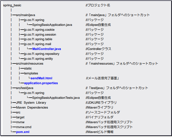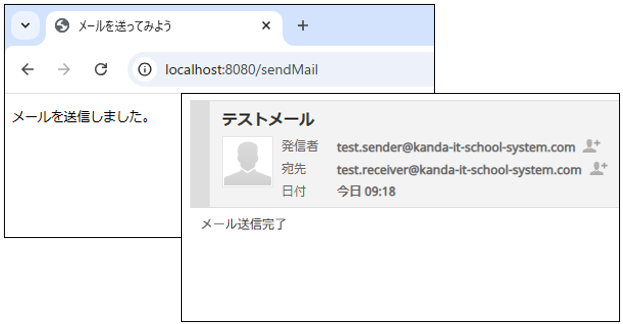 [java] package jp.co.f1.spring.mail; import org.springframework.beans.factory.annotation.Autowired; import org.springframework.mail.MailSender; import org.springframework.mail.SimpleMailMessage; import org.springframework.stereotype.Controller; import org.springframework.web.bind.annotation.GetMapping; import org.springframework.web.servlet.ModelAndView; @Controller public class MailController { @Autowired private MailSender mailSender; /* * 「/sendMail」へアクセスがあった場合 */ @GetMapping(“/sendMail”) public ModelAndView sendMail(ModelAndView mav) { SimpleMailMessage msg = new SimpleMailMessage(); msg.setFrom(“test.sender@kanda-it-school-system.com”); msg.setTo(“test.receiver@kanda-it-school-system.com”); msg.setSubject(“テストメール”); msg.setText(“メール送信完了”);// Set Message mailSender.send(msg); mav.setViewName(“sendMail”); return mav; } } [/java]