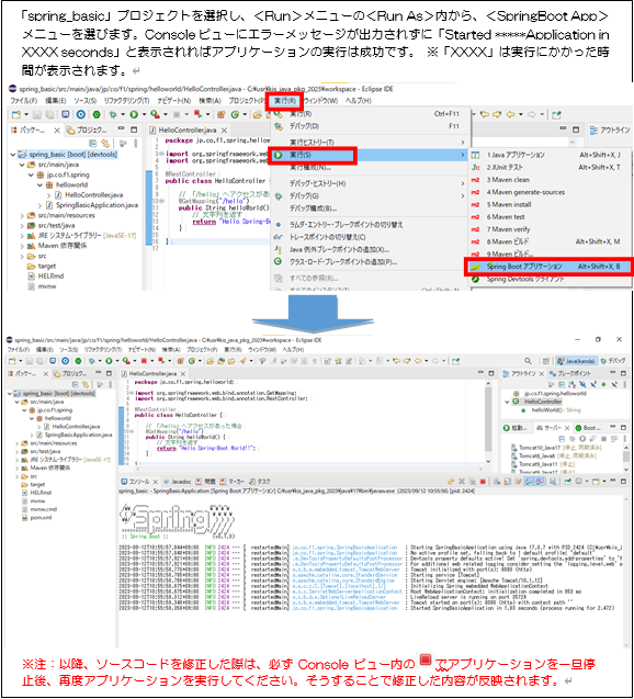 このサンプルプログラムは、Springで「Hello Spring-Boot World!!」という文字列を表示するプログラムです。簡単なアプリケーションを手順通り作成することで、Springを用いたアプリケーションの作成方法を学習していきます。