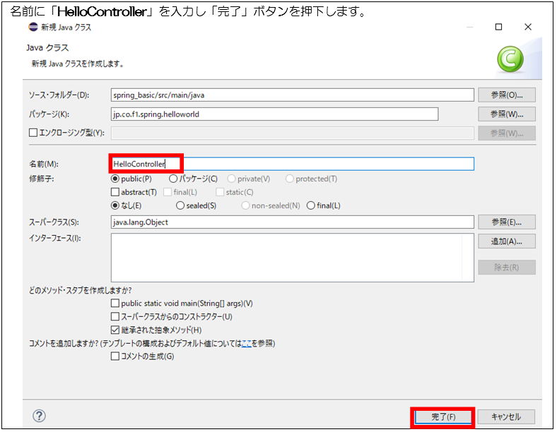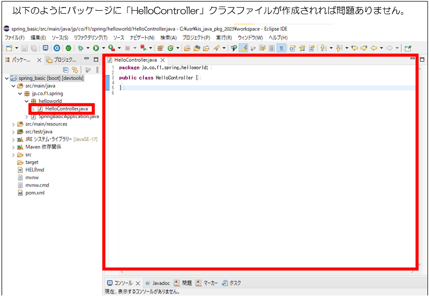 「HelloController.java」クラスファイルの作成とソースコードの記述