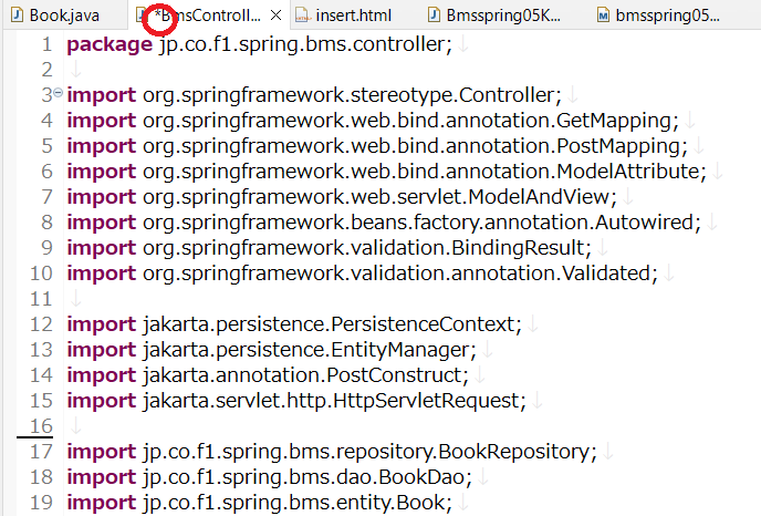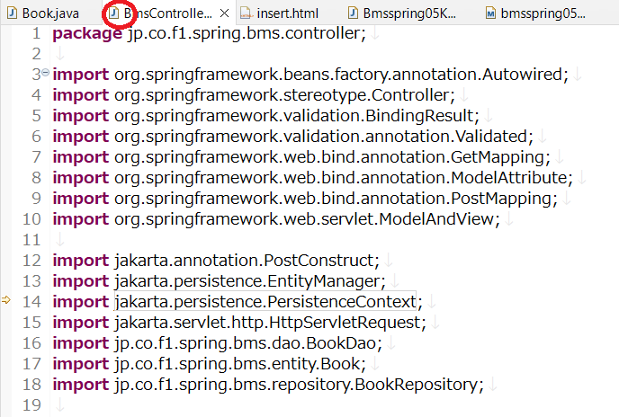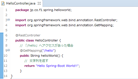 [java] package jp.co.f1.spring.helloworld; import org.springframework.web.bind.annotation.RestController; import org.springframework.web.bind.annotation.GetMapping; @RestController public class HelloController { // 「/hello」へアクセスがあった場合 @GetMapping(“/hello”) public String helloWorld() { // 文字列を返す return “Hello Spring-Boot World!!”; } } [/java]