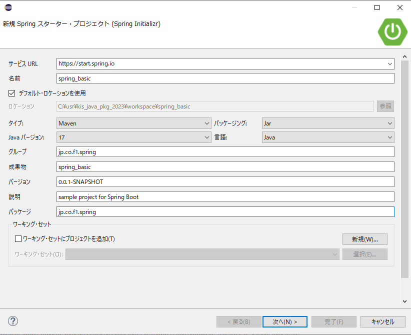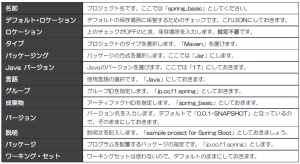 画面に「新規Springスターター・プロジェクト」というダイアログウィンドウが現れます。ここで、作成するプロジェクトの設定を入力していきます。以下を参考に入力してください。