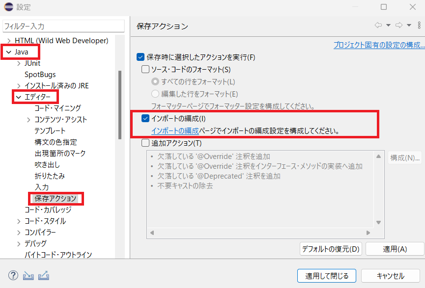 インポート文の可読性を上げるためにも、研修中は上記のチェックを外し、自動編成されないように予め設定を変更してください。
