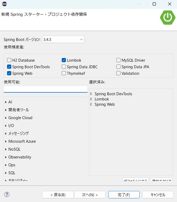 「Spring Web」のほかに「Spring Boot DevTools」「Lombok」のチェックがデフォルトで付いていますがそのまま「完了」ボタンを押して作成してください。