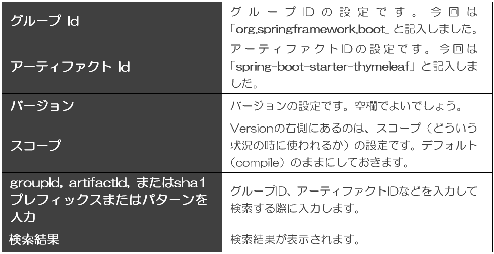 これが、Thymeleafを利用するためのタグです。「spring-boot-starter-thymeleaf」とアーティファクトIDが指定されていることからもわかるように、これはSpringスタータープロジェクトでThymeleafを利用するためのライブラリです。これを追加することで、SpringスタータープロジェクトでThymeleafを利用する為に必要なものがすべて用意されます。