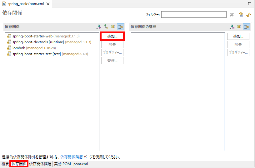 エディタの下部には、いくつもの切り替えタブが並んでいます。この中から、「依存関係(Dependencies)」タブをクリックすることで、ライブラリの設定(pom.xmlファイルの <dependencies> タグに記述するもの)を行なえます。