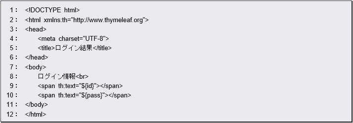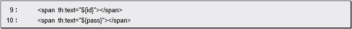 このth:textには、「${id}」「${pass}」という値が記述されています。これは、あらかじめ用意された「id」「pass」という変数をここに埋め込むことを示します。Thymeleafでは、このように記述してコントローラー側で用意した値をここに出力することができます。