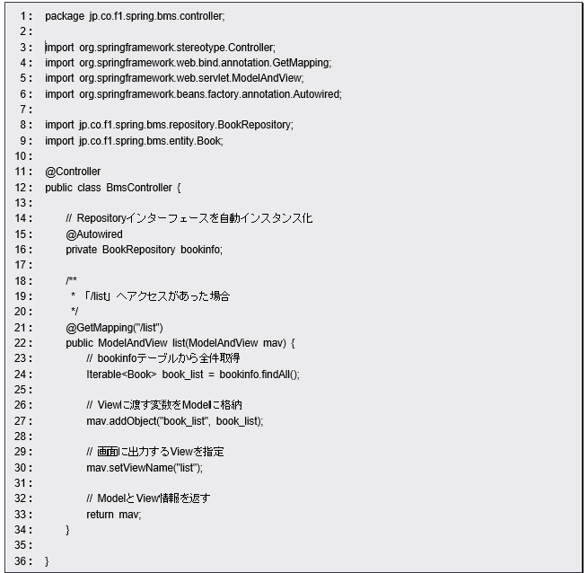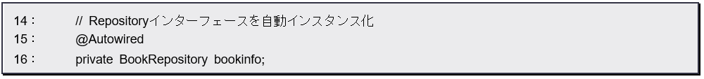 最初に@Autowiredアノテーションを使って、BookRepository インスタンスをフィールドに関連付けています。この@Autowiredというアノテーションは、アプリケーションに用意されているBeanオブジェクト(Spring MVCによって自動的にインスタンスが作成され、アプリケーション内で利用可能になったもの)に関連付けを行ないます。これにより、BookRepositoryのインスタンスが自動的にbookinfoフィールドに設定されます。