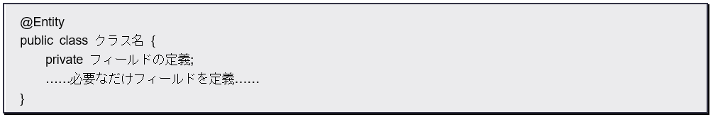 では、エンティティクラスはどのように作成されるのでしょうか。その基本形を整理すると以下のようになるでしょう。