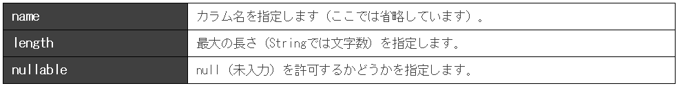 このアノテーションには、フィールドに関するいくつかの引数が用意できます。ここでは以下のようなものを使っています。