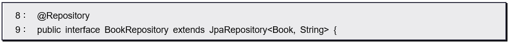 「<Book, String>」という指定により、このリポジトリの対象となるエンティティクラスが Book であり、プライマリーキーとなるのが String型 の値であることが指定されています。