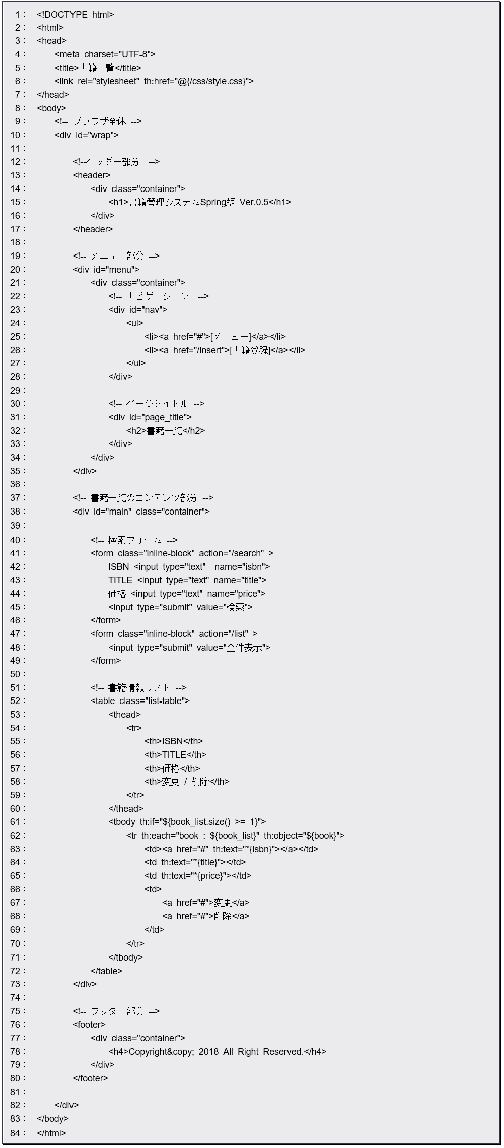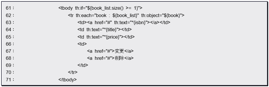 まず、61行目の th:if=”${book_list.size() >= 1}” でコントローラーから渡された変数 book_list の要素数を判定しています。もし条件を満たす場合は、その中の表示処理が行われます。