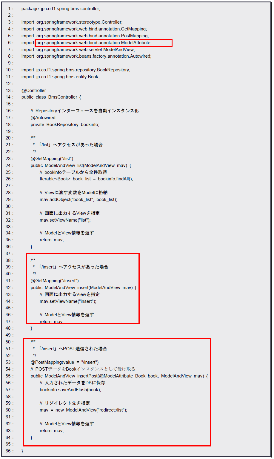 [html] package jp.co.f1.spring.bms.controller; import org.springframework.stereotype.Controller; import org.springframework.web.bind.annotation.GetMapping; import org.springframework.web.bind.annotation.PostMapping; import org.springframework.web.bind.annotation.ModelAttribute; import org.springframework.web.servlet.ModelAndView; import org.springframework.beans.factory.annotation.Autowired; import jp.co.f1.spring.bms.repository.BookRepository; import jp.co.f1.spring.bms.entity.Book; @Controller public class BmsController { // Repositoryインターフェースを自動インスタンス化 @Autowired private BookRepository bookinfo; /* * 「/list」へアクセスがあった場合 */ @GetMapping(“/list”) public ModelAndView list(ModelAndView mav) { // bookinfoテーブルから全件取得 Iterable<Book> book_list = bookinfo.findAll(); // Viewに渡す変数をModelに格納 mav.addObject(“book_list”, book_list); // 画面に出力するViewを指定 mav.setViewName(“list”); // ModelとView情報を返す return mav; } /* * 「/insert」へアクセスがあった場合 */ @GetMapping(“/insert”) public ModelAndView insert(ModelAndView mav) { // 画面に出力するViewを指定 mav.setViewName(“insert”); // ModelとView情報を返す return mav; } /* * 「/insert」へPOST送信された場合 */ @PostMapping(value = “/insert”) // POSTデータをBookインスタンスとして受け取る public ModelAndView insertPost(@ModelAttribute Book book, ModelAndView mav) { // 入力されたデータをDBに保存 bookinfo.saveAndFlush(book); // リダイレクト先を指定 mav = new ModelAndView(“redirect:/list”); // ModelとView情報を返す return mav; } } [/html]