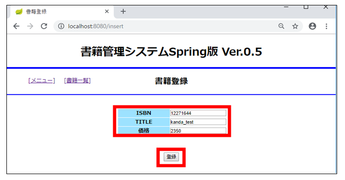 図 6.5 2:アプリケーションアクセス画面(書籍登録画面で入力後、登録ボタンクリック)