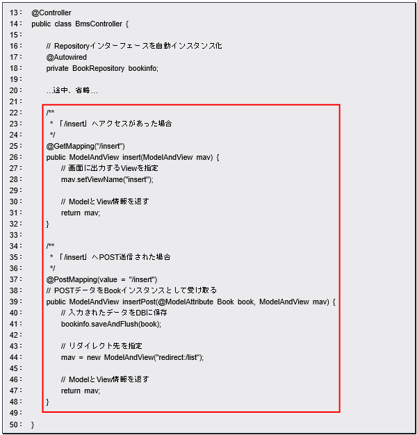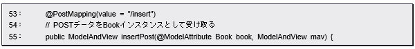 insertPostメソッドにはBookインスタンスが引数として指定されていますが、これには「@ModelAttribute」というアノテーションが付けられています。これはエンティティクラスのインスタンスを自動的に用意するのに用いられます。引数には、インスタンスの名前を指定します。