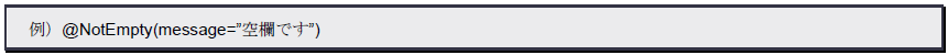 サンプルで使いましたね。Stringの項目で、値がnullまたは空白だった場合エラーにします。未入力を防ぐようなときに用いられます。引数には「message」という値に未入力時に表示する文字列を指定します。