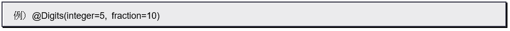 数値入力のためのアノテーションですが、単純に値の大小をチェックするのではありません。これは、整数部分と小数部分の桁数制限を行ないます。引数が2つあり、「integer」で整数桁数を、「fraction」で小数桁数をそれぞれ指定します。これらの引数は、()内に「integer=10, fraction=10」といった具合に、それぞれの項目にイコールで値を代入するような形で記述をします。
