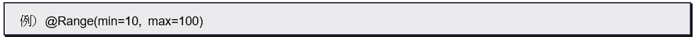 数値項目で用います。最小値、最大値を指定し、一定範囲内の値のみを入力できるようにします。基本的には、@Minと@Maxを併用するのと同じですが、こちらは1つのアノテーションにまとめています。引数に「min」「max」があり、それぞれ最小値、最大値を指定できます。