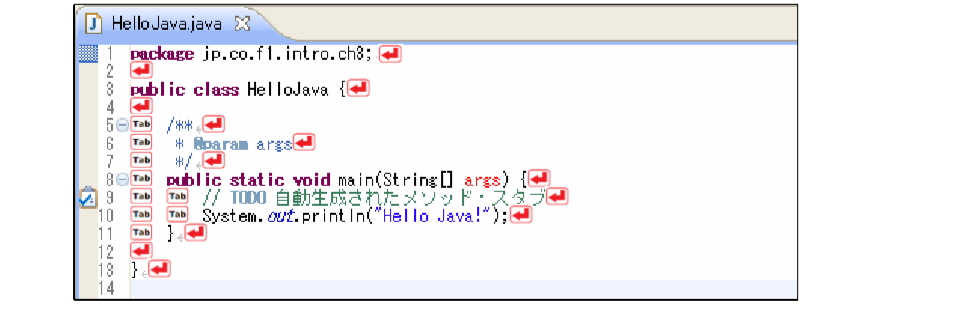 次の図 3.2.2 では、改行とインデントの箇所をまとめています。インデントは、Tab キーを使って入力します。