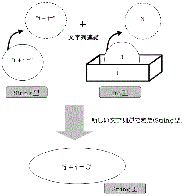 まず①の演算部分を説明します。以下の図5.3.4は上の①演算部分である「”i + j =” + i」を表しています。左辺にString型があるので、+演算子は加算ではなく文字列連結として作用します。その結果は新しいString型として「”i+j=3”」となります。