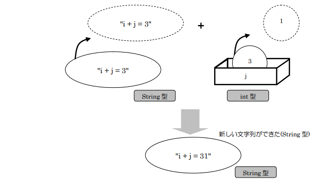 次に②の演算部分を説明します。ここでは①の演算結果をもとに「”i + j = 3″ + j」という演算を行います。String型(文字列型)とint型との演算を行うので、ここでも加算ではなく文字列を連結します。その結果、表示されるのは「”i + j = 31″」となります。②の演算部分のイメージを以下の図5.3.5に示します。