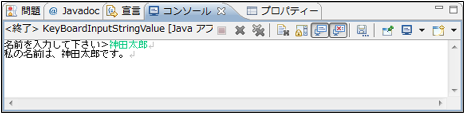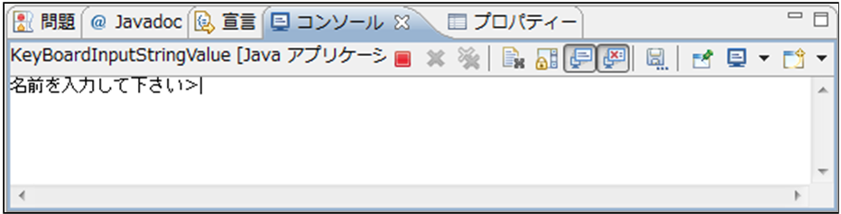 [html] package jp.co.f1.superintro.ch05; import java.util.Scanner; public class KeyBoardInputStringValue{ public static void main(String[] args) { Scanner sc = new Scanner(System.in); System.out.print(“名前を入力して下さい>”); String name = sc.nextLine(); System.out.println(“私の名前は、” + name + “です。”); } } [/html]実行結果