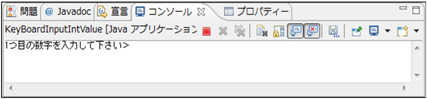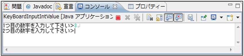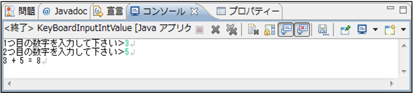 [html] package jp.co.f1.superintro.ch05; import java.util.Scanner; public class KeyBoardInputIntValue { public static void main(String[] args) { Scanner sc = new Scanner(System.in); System.out.print(“1つ目の数字を入力して下さい>”); int num1 = sc.nextInt(); System.out.print(“2つ目の数字を入力して下さい>”); int num2 = sc.nextInt(); System.out.println(num1 + ” + ” + num2 + ” = ” + (num1 + num2)); } } [/html]実行結果