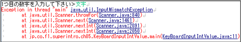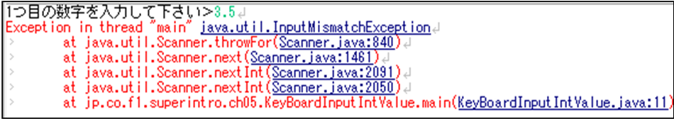 対応するデータ型以外の型のデータを入力した場合このプログラムでは、int型の値をキーボードから入力しています。もしint型以外の値を入力した場合はどうなるのでしょうか。KeyBoardInputIntValue.javaを実行し、int型以外の値を入力してみましょう。