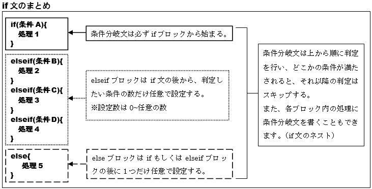 if文のネストについては次項で学習していきます。また、PHP入門で学習したif文についてのまとめを以下に示します。