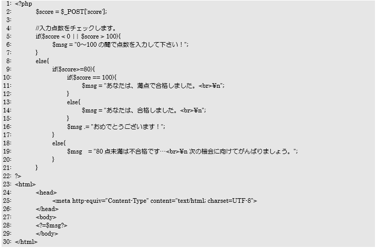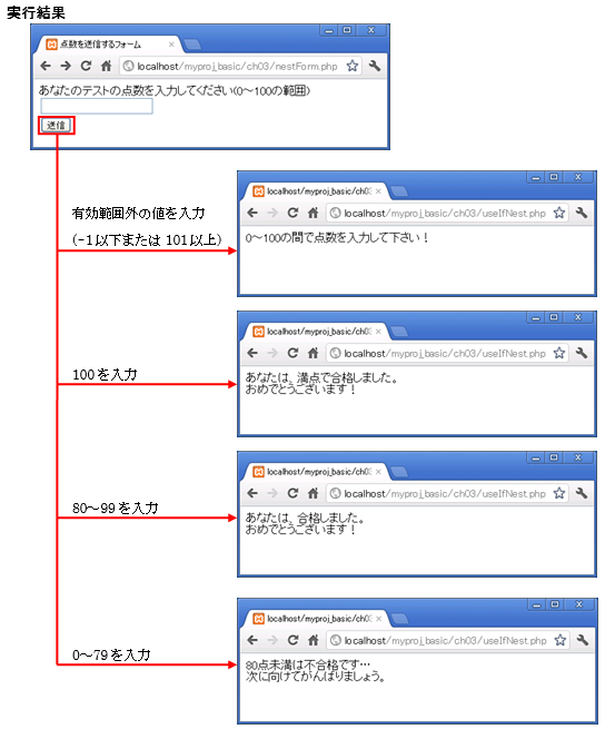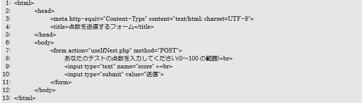 今回のプログラムは「nestForm.php」からの入力データ(点数)を「useIfNest.php」で受け取り、その点数を条件分岐文で判定しその点数に応じたメッセージを画面に出力させます。