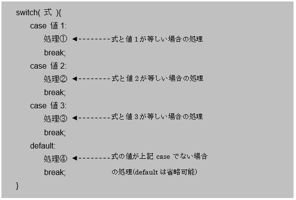 switch文は、複数のcaseの中から、式(変数や計算式)の値に合うものを選びその処理を実行します。式の値がcaseのどれにも当てはまらない時はdefaultの処理を行います。また、各caseの処理の最後にはbreak文を記述してswitch文を抜け、選択されたcaseの処理のみを行うようにしています。breakを省略してしまうと、その下のcaseの処理まで実行されるので注意が必要です。