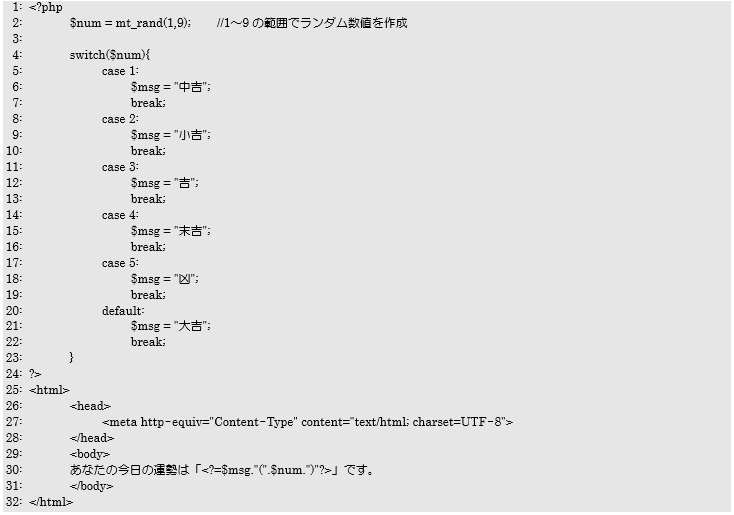 30行目で運勢結果とランダムで発生させた数値の確認のために、変数$numの値を画面に表示させています。