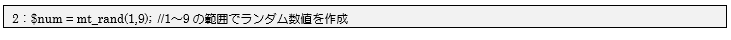 2行目で変数$numに組み込み関数mt_randを使って、ランダムな数値(1~9)を1つ代入しています。